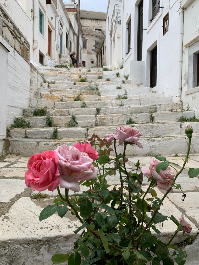 A Naxos ci sono piccole farfalle gialle, rosa e azzurre. L’aria sa di salsedine dolce e di erbe aromatiche. C’è sempre un po’ di vento e si può vivere spettinati senza nessuna fatica. Ci sono tantissimi gatti e le case bianche con gli scuri azzurri, blu e a volte rosa. Le chiese ortodosse all’entrata hanno cesti di pane per chi ne ha bisogno e una penombra nella quale l’unica cosa che vuoi fare è accendere quelle sottili candele che profumano proprio di cera e offrire tutto ciò che hai di più caro a Dio. Spesso nelle stradine si trovano ceri accesi e piccoli mazzi di fiori e ad ogni porta c’è una ghirlanda di benvenuto fatta coi fiori dell’isola.
